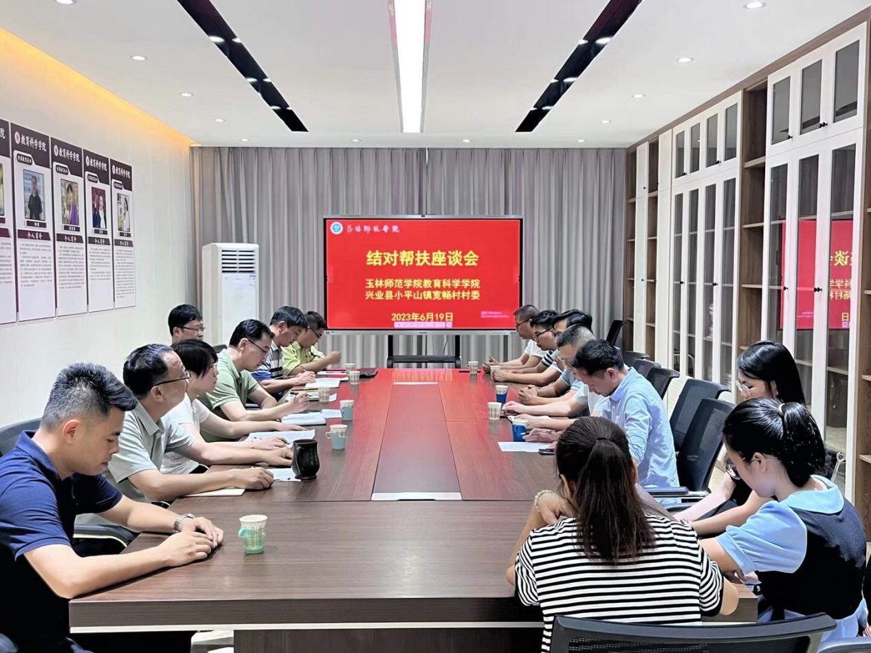 为贯彻落实党的二十大精神,将深入开展学习贯彻习近平新时代中国特色社会主义思想主题教育转化为助力乡村振兴的生动实践和具体成效,推动主题教育走深走实,6月18日,教育科学学院与兴业县小平山宽畅村村委在明德楼408召开结对帮扶座谈会,兴业县小平山镇党委副书记罗钊和兴业县小平山镇村干部一行,学校派驻宽畅村第一书记李秋志,学院领导班子成员参加本次会议,会议由学院党委书记崔海波主持。