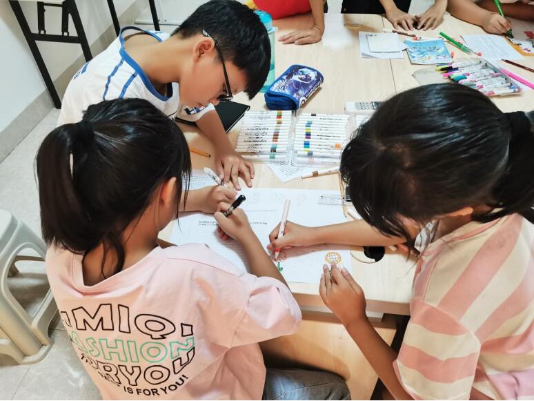 (绘画课上,孩子们小组合作完成主题手抄报)