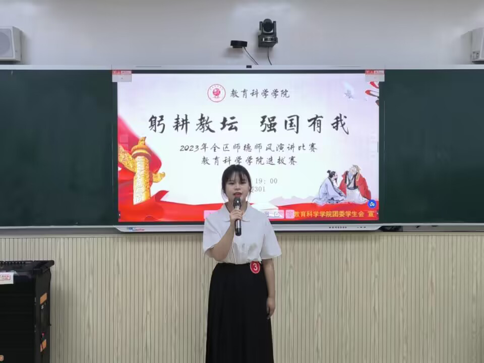为提高师范生语言表达能力和综合素质,展现未来教师风采,进一步营造尊师重教氛围,10月13号晚,我院在东校区明德楼301教室开展“躬耕教坛 强国有我”2023年全区师德师风演讲比赛——教育科学学院选拔赛。本次比赛由我院小学教育理科(定向)2022(2)班邱盈担任主持人,我院副院长程传利,教师钟武媚、陈峥婷担任评委,我院学生代表到场参加。