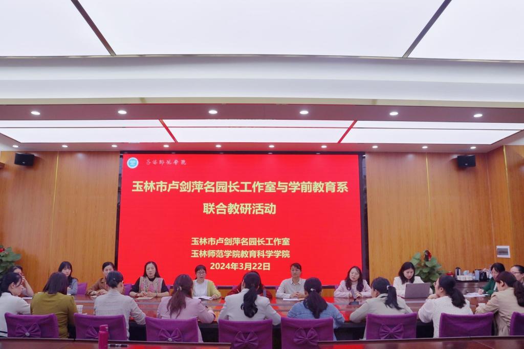 3月22日下午,我院于我校明德楼学院会议室与玉林市卢剑萍名园长工作室开展联合教研活动。我院副院长杨振芳,玉林市机关直属机关第一幼儿园园长卢剑萍以及双方教师代表到场参加本次联合教研活动。