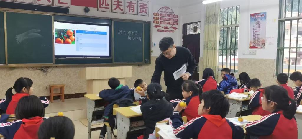 本次教研活动由挂职教师蒋鹏矫老师执教三年级上册第五单元习作《我眼中的缤纷世界》。蒋老师引导学生学会从不同角度来观察周围的生活、眼中的事物,点燃学生思维的火花,让学生畅所欲言表达自己所观所感。为了让学生更直观的观察事物,蒋老师将实物“橘子”带进课堂供学生细致观察,从而引导学生更好的完成写作。