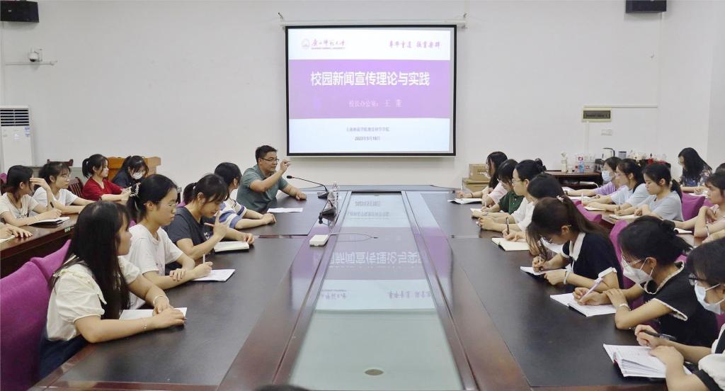 培训会上,王董针对微信团、记者团的工作内容进行经验分享和工作指导。他强调,微信推文小编要注意政治立场及政治正确,注重排版风格,文本框的选择,推文标题既要具备吸引力又要避免低俗化,推文内容需与生活、教育相关;记者团成员要注重写作方法,他表示,写作是记者的基本功,记者要了解新闻的概念,新闻稿的特点、写作方法以及消息写作技巧。此外,他重点强调会议新闻、人物通讯稿的注意事项,分享自身新闻写作感悟,并以广西师范大学的新闻稿为范本为在场人员讲述如何写好一篇新闻稿,鼓励记者在新闻写作方面,要充分发挥新闻报道“快、准”的特点,做到时效要新、内容要准、质量要高。最后,他针对摄影技巧提出拿好相机、找好角度、优化构图等建议。